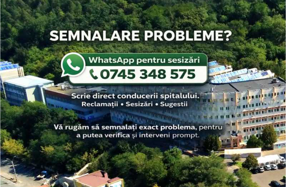 Managerul unității sanitare, conf. dr. Alexandru Pătrașcu, a precizat că la numărul 0745.348.575 pot fi transmise direct conducerii SJU sesizări privind actul medical, probleme legate de comportament, situații administrative, deficiențe privind condițiile din spital și orice aspect care necesită verificare.